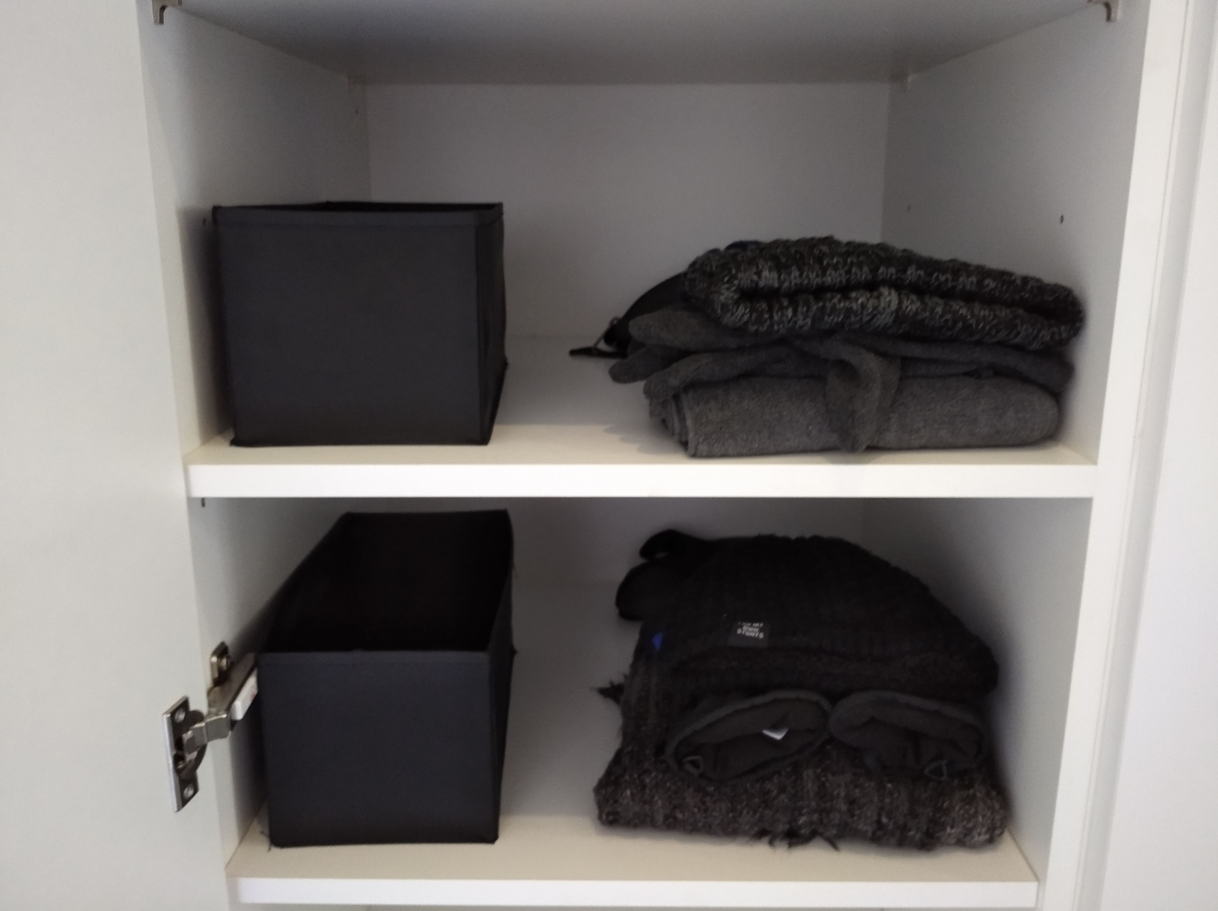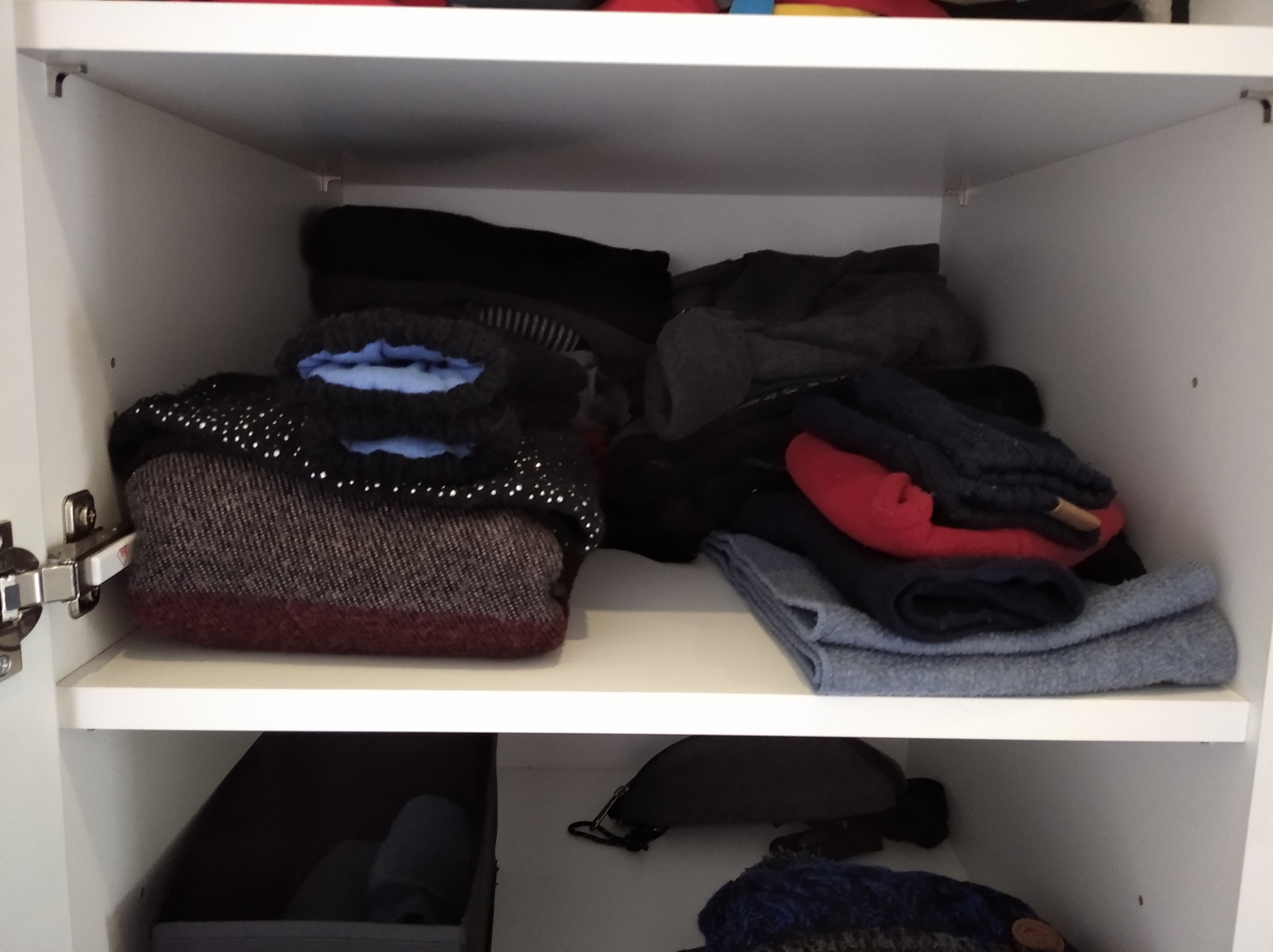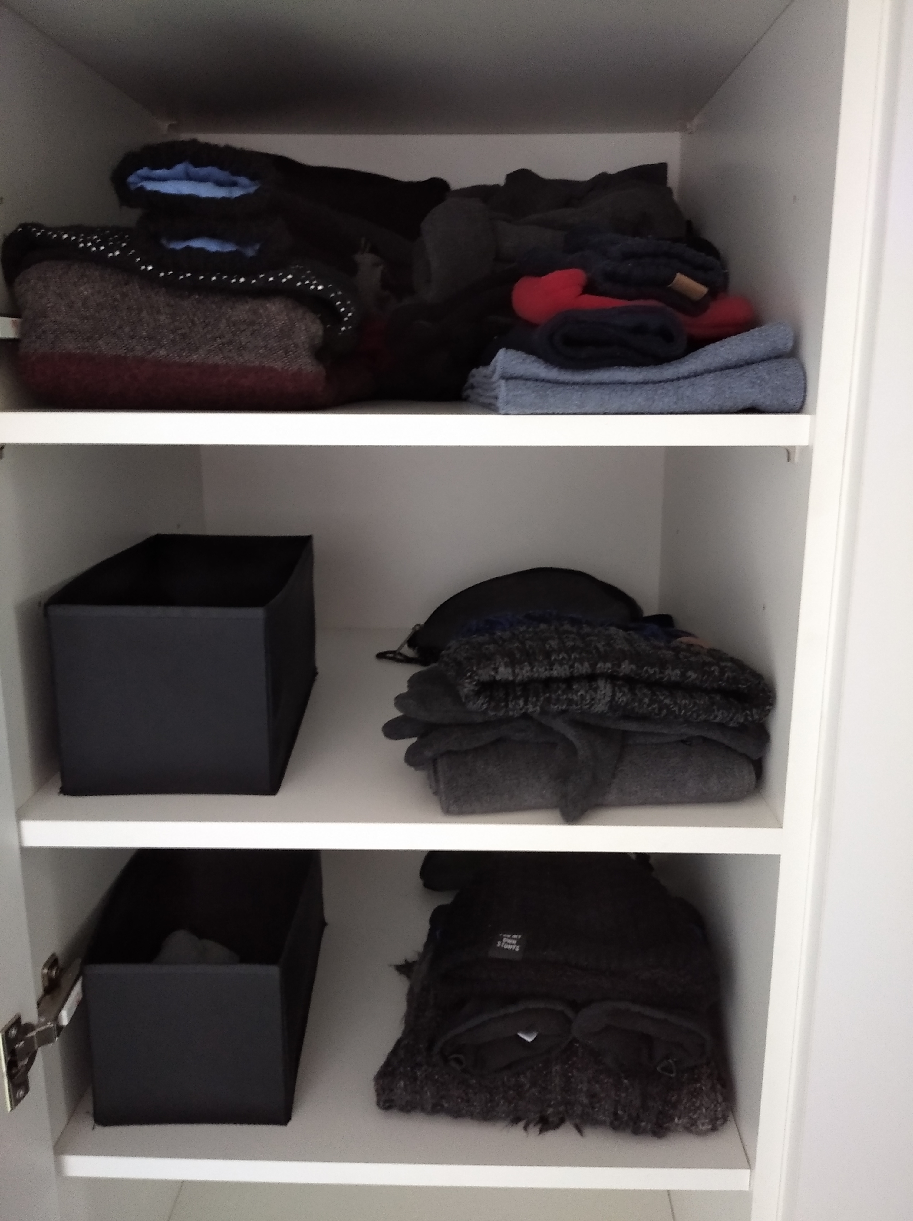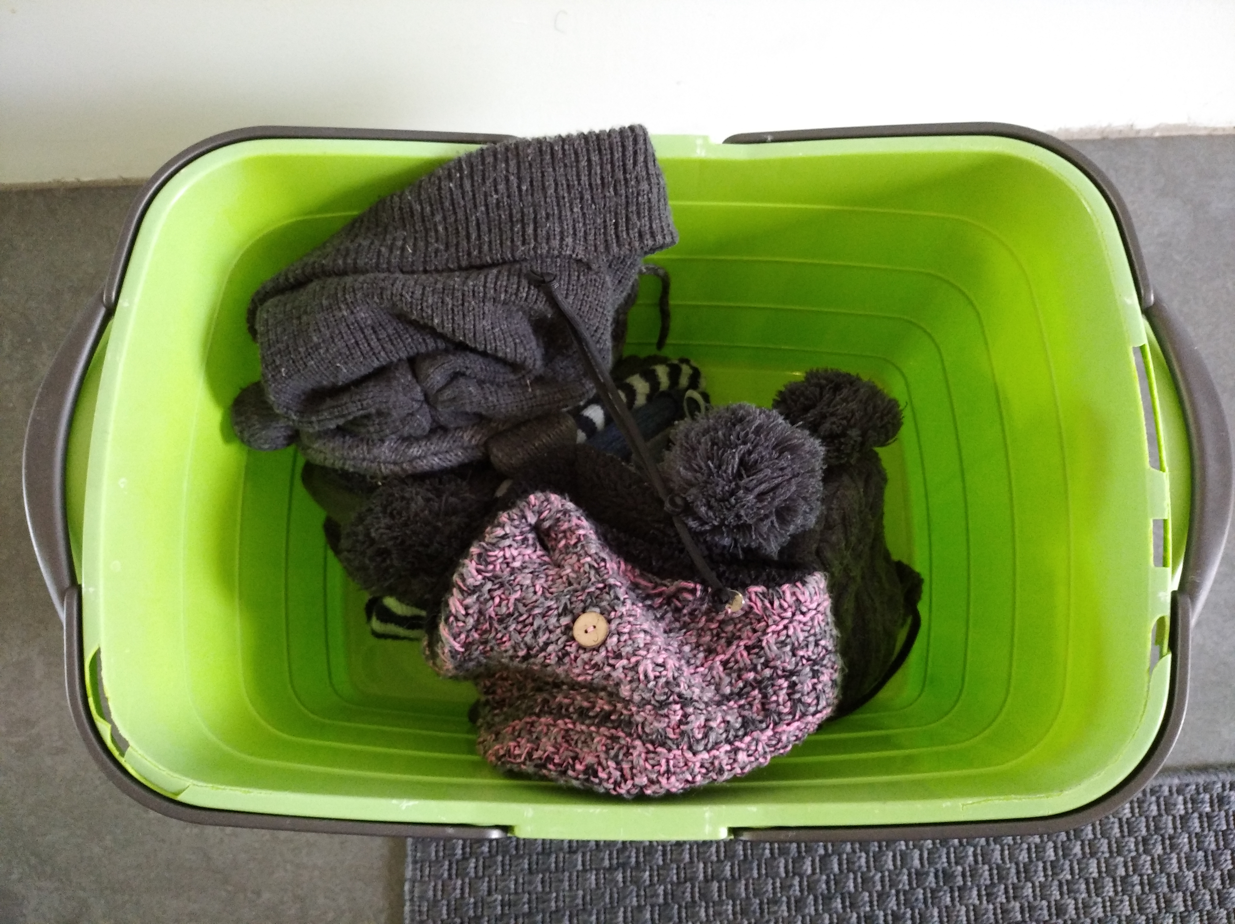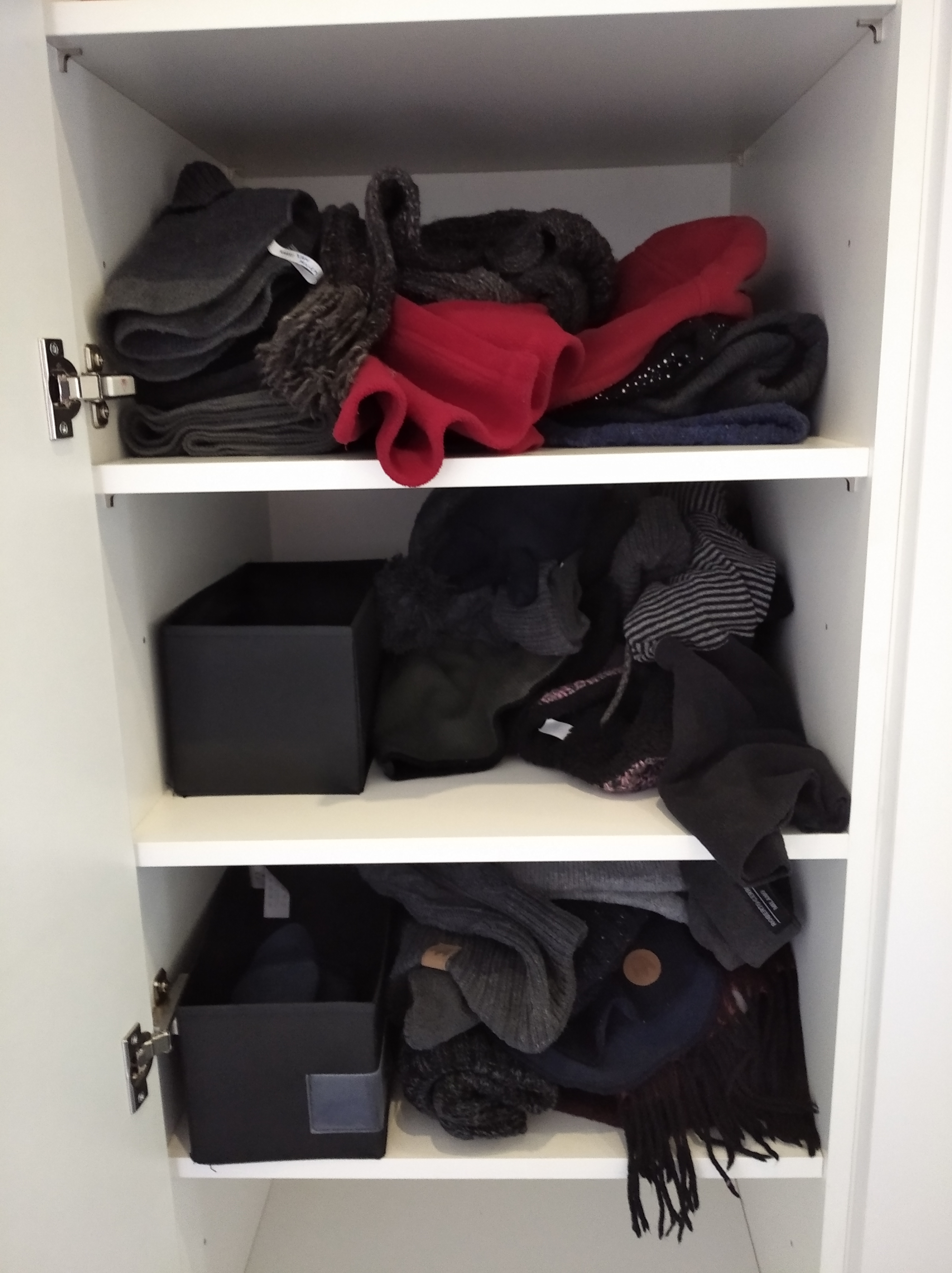 Mijn idee was om gewoon voor iedereen 1 muts, 1 paar handschoenen en 1 sjaal te houden. Een blik op de kast zoals die eruit zag, zegt dat we meer in huis hadden: