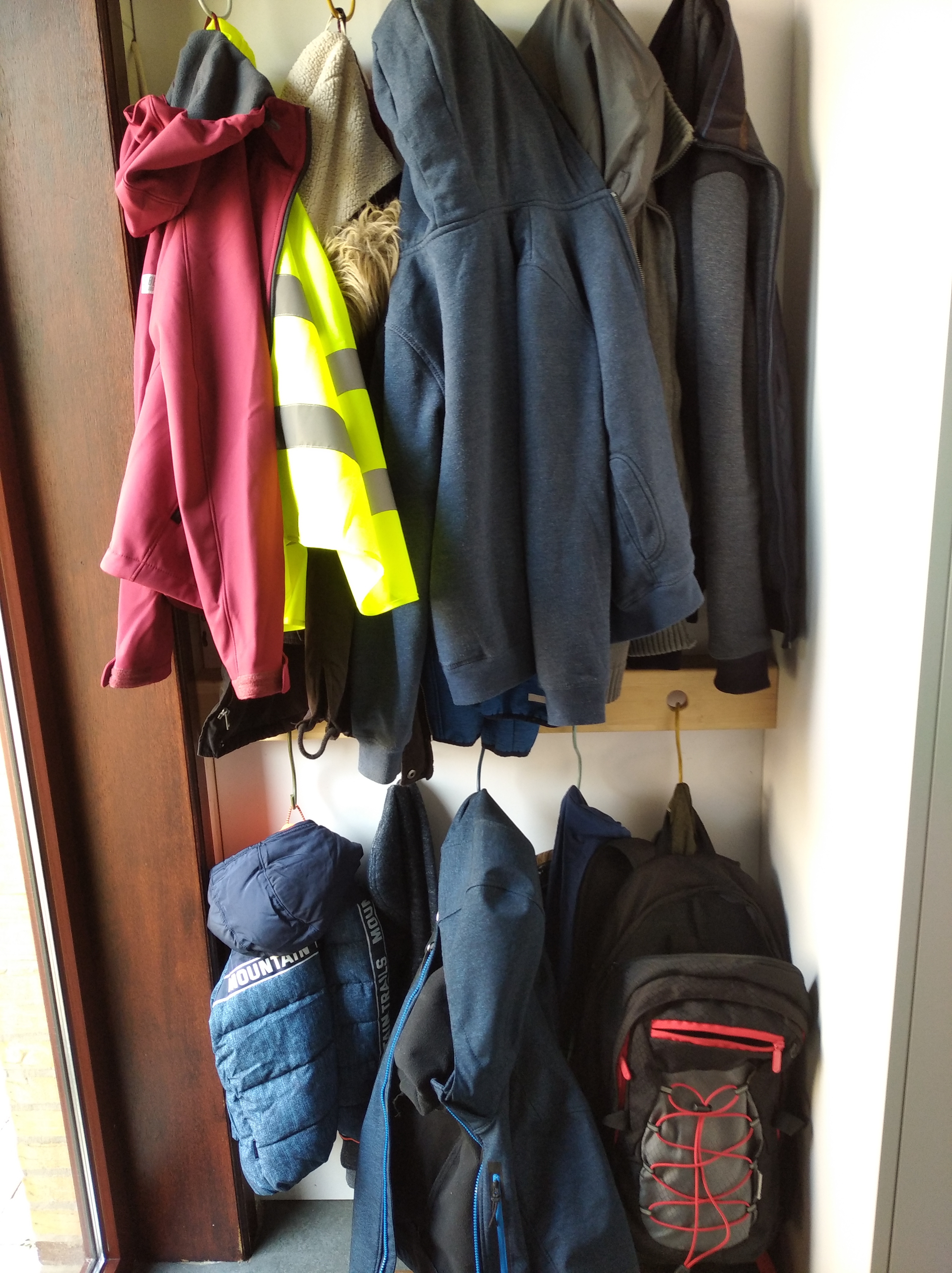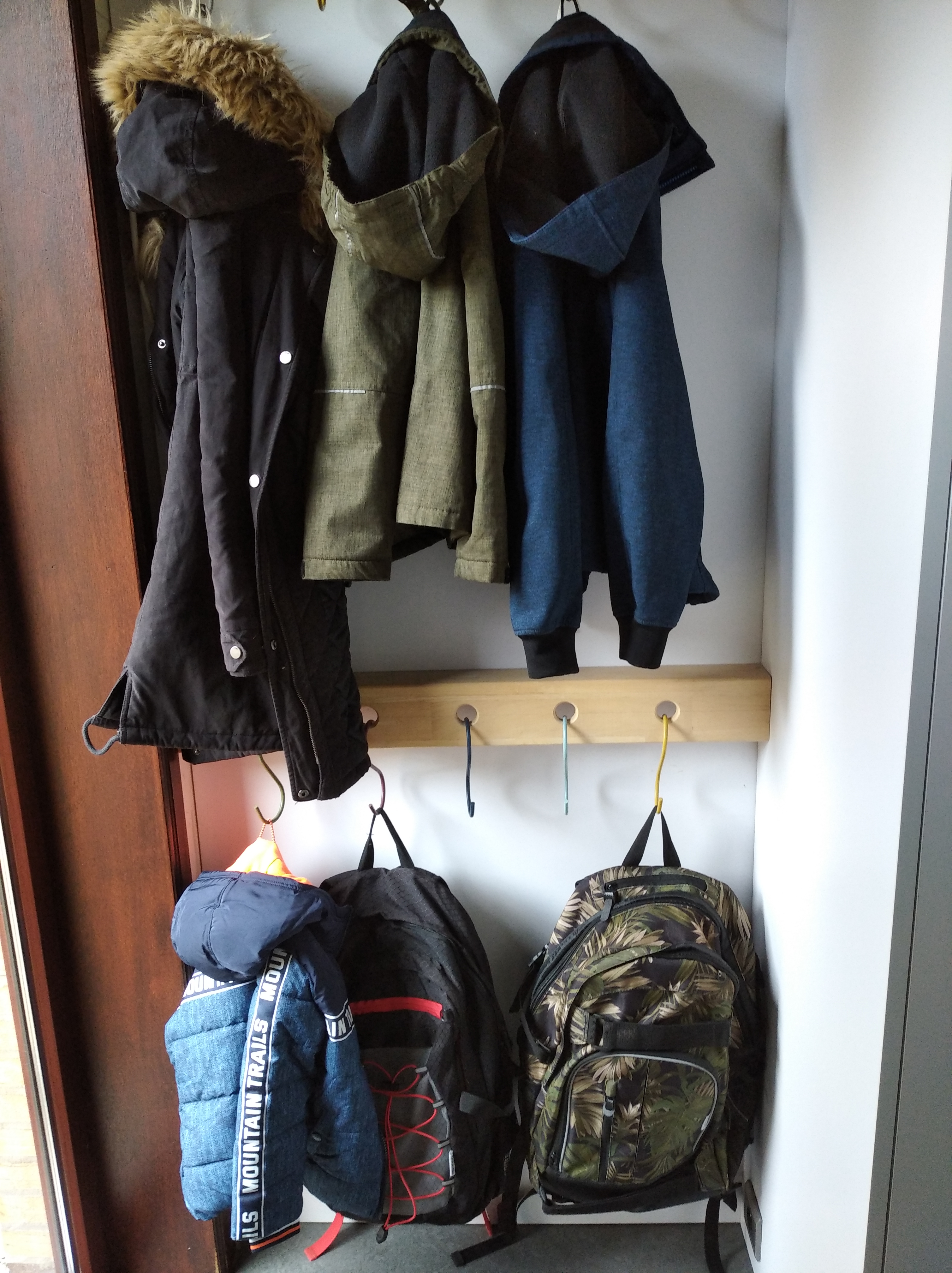 Enfin, aan de kapstok in de hal hangt nu dus gewoon één jas per gezinslid en de schoolrugzakken. Dat ziet er dan zo uit (zonder Marcels winterjas, die volgens mij in de auto ligt):