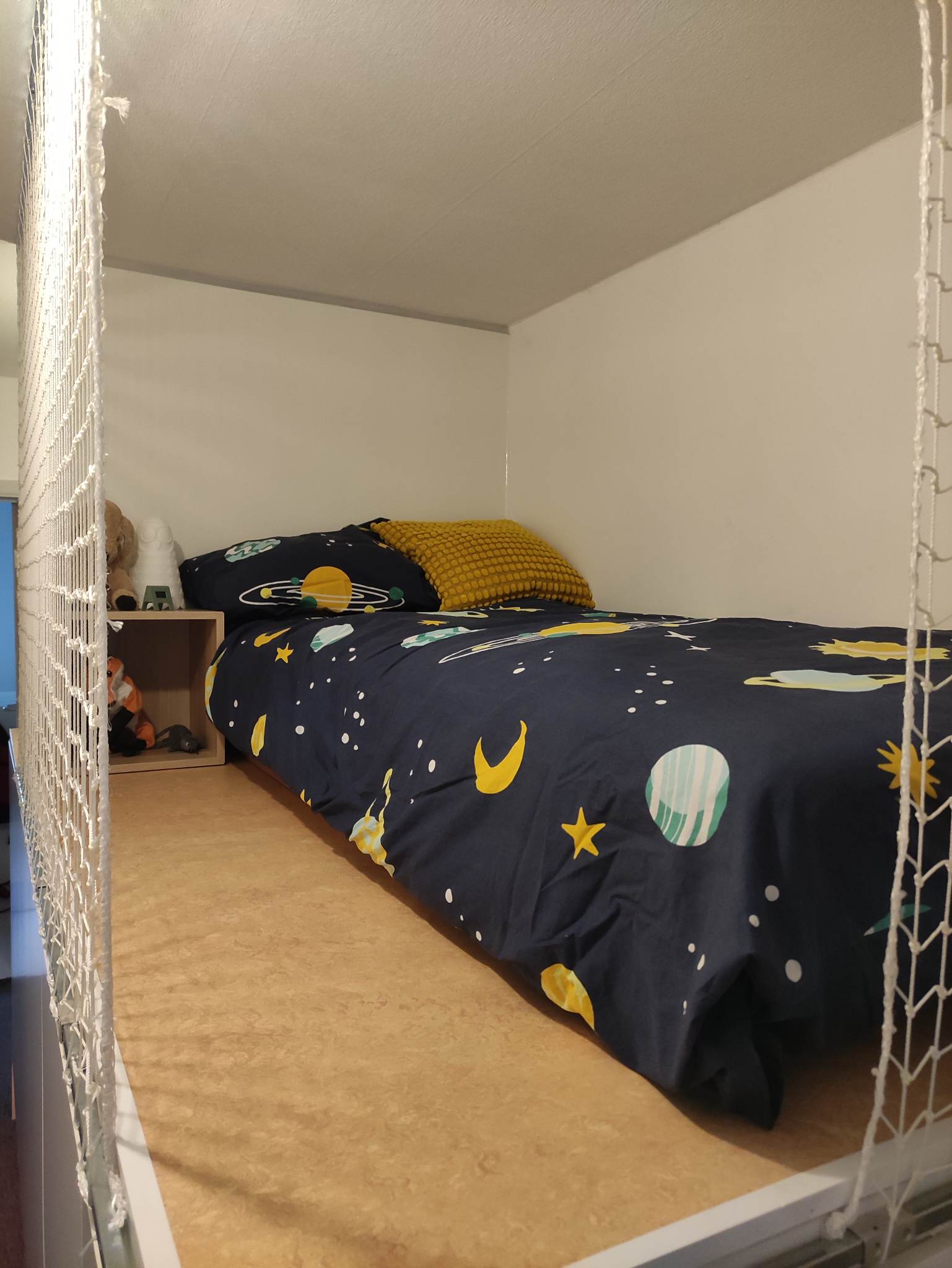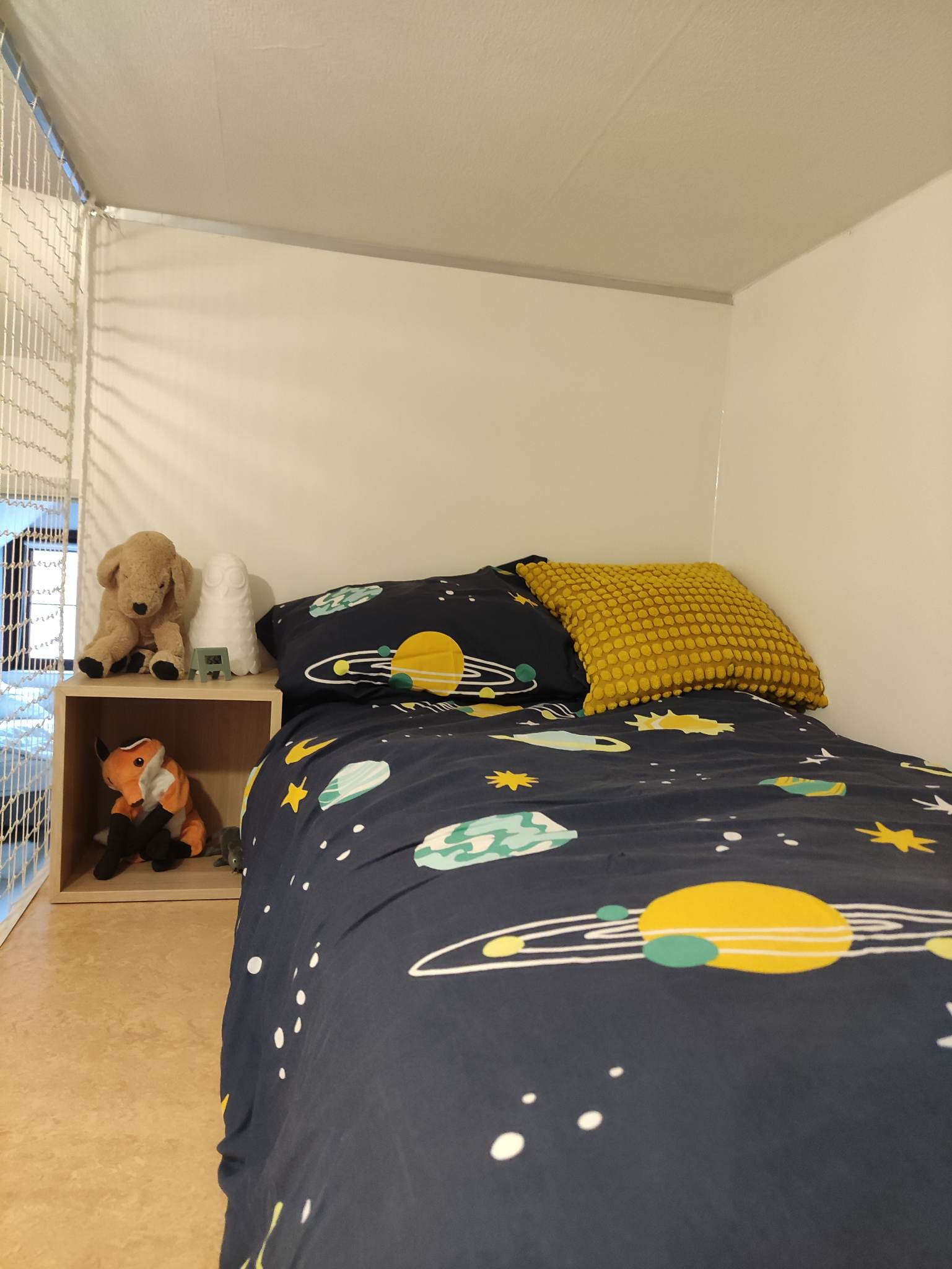 Verder gebiedt de eerlijkheid me te zeggen dat het nog niet helemaal klaar is. Zijn nachtlampje heeft nog geen stroom, en de ladder om erop te geraken is nu nog de metalen trapladder van Marcel, maar die wordt hopelijk binnenkort vervangen door een mooie, houten molenaarstrap. En waarschijnlijk komen er op termijn nog gordijntjes voor wat meer privacy. Als hij daar zelf naar begint te vragen.